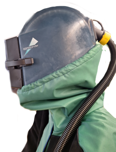 - Großzügige Halskrause zur optimalen und staubdichten Befestigung am Strahlhelm.