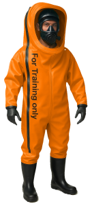 Chemical protective suit for practicing and simulating operations involving hazardous solid, liquid, and gaseous substances, including liquid aerosols and solid particles.
